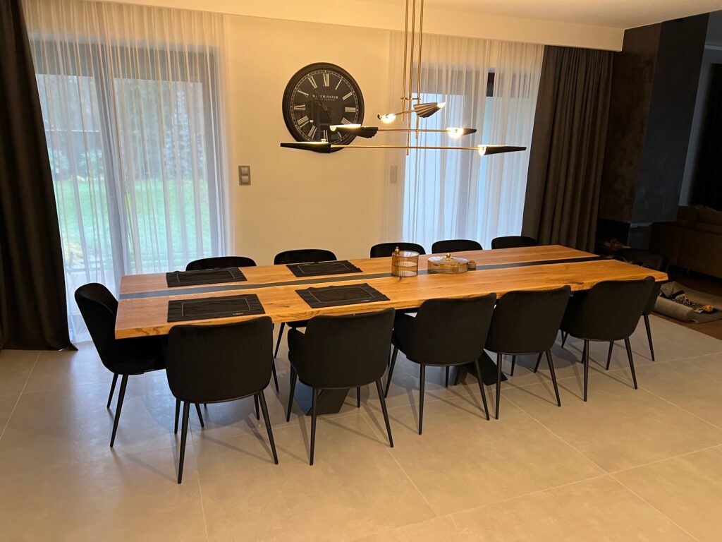 Nie mamy gotowych modeli na magazynie. Każdy stół wykonujemy indywidualnie, w naszej stolarni, z litego drewna lub materiałów wykończeniowych wybranych wspólnie z klientem. Dzięki temu mebel pasuje nie tylko rozmiarem, ale też formą i wykończeniem.