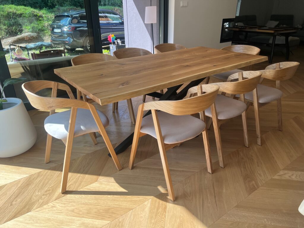 Najczęściej pracujemy z litym drewnem dębowym lub bukowym – dobrze sprawdza się w stołach, które są intensywnie użytkowane. Oferujemy także wersje z: